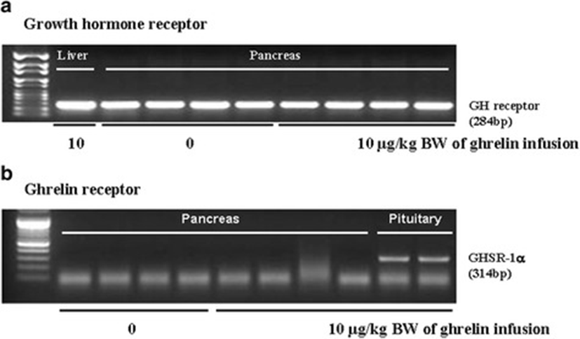 In the previous study, we showed that increasing plasma CCK level did not significantly increase pancreatic α-amylase expression [9]. However, it differed from those of other previous studies [4, 5, 10, 11]. We therefore hypothesized that the mechanism related to pancreatic exocrine secretion may have down-regulating factor by exogenous ghrelin. We believed that GH might be one of these factors. Studies by Anderson and Hellman et al. [12, 13] reported that GH decreases insulin secretion via mitogen-activated protein (MAP) kinase signaling and has a paracrine effect on endocrine secretion. Thus, we investigated the levels of plasma ghrelin and CCK by i.p. infusion with exogenous ghrelin (0, 0.1, 1.0 and 10.0 μg/kg BW). The i.p. infusion of ghrelin at the dose of 1.0 and 10.0 μg/kg BW significantly increased plasma concentrations of ghrelin (p < 0.05) whereas no significant differences in the plasma CCK level was observed (Fig. 1a, b). The western blot analysis of pancreatic α-amylase activity (Fig. 2) suspected that ghrelin may regulate exocrine secretion through other signals; direct or indirect actions not releasing CCK. Thus, we assumed the signal pathway related to pancreatic α-amylase secretion either ghrelin’s direct action or other factors. To further elucidate the mechanism related to pancreatic α-amylase secretion, ghrelin receptor (GHSR-1α) and GH receptor mRNA expression were examined using RT-PCR (Fig. 3). In addition, the results indicated ghrelin may indirectly influence the pancreatic α-amylase secretion via releasing GH.