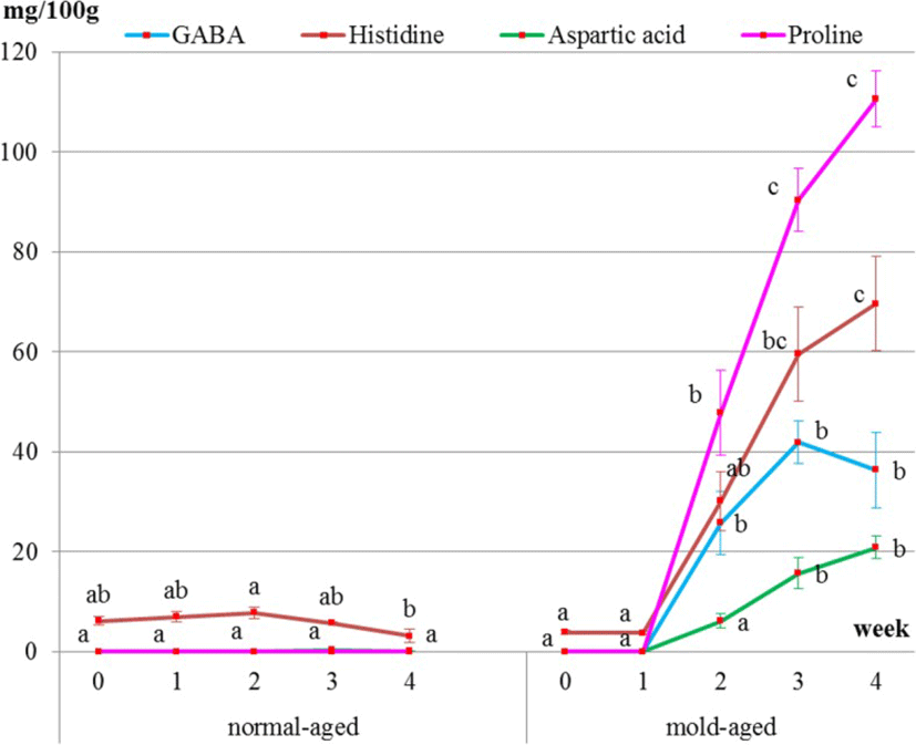 It is particularly interesting that the amino acids increased on the meat surface during the mold-aging process but not during the normal-aging process. GABA, one of the functional amino acids, that is famous for its sedative and other effects [1] significantly increased after 2 weeks of mold-aging, when the mold completely covered the surface meat. To the best of our knowledge, there have been no previous reports of GABA content in beef meat. It is, therefore, highly possible that our mold strain itself produced GABA, proline, and aspartic acid during growth.