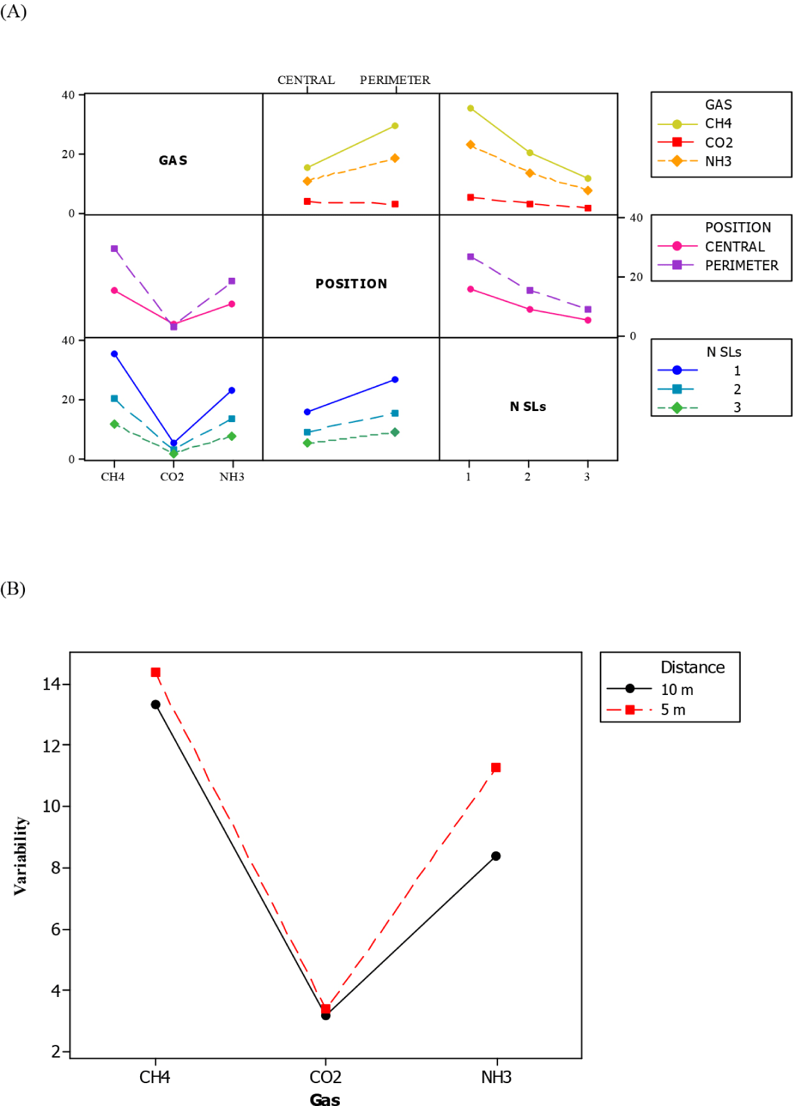 Based on the results of the two-way ANOVA, the position of SLs, the number of the SLs, and the interaction between the position of SLs and the number of the SLs had p lower than 0.001. The outcomes related to the third experiment showed that the position of SLs and the number of the SLs affect the variability of the gas distribution when the mean value of the gas concentration is computed (Fig 4A). The variability is reduced under the 10% in central zone and 16% in the perimeter one when three SLs samples are located. Moreover, a 10 meters distance between two SLs reduced significantly (p < 0.05) NH3 variability more than when SLs have a distance of 5 m (Fig. 4B).