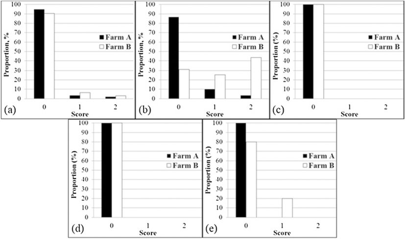 Huddling, shivering, and panting are animal-based indicators of thermal comfort [10]. In terms of huddling (Figure 3c) and shivering (Figure 3d), both farms showed good welfare quality based on the lack of huddling or shivering behavior in pigs (score 0). However, about 20% of pens in farm B indicated panting behavior (Figure 3e), which is one way for pigs to dissipate body heat. As explained previously, the room temperature in farm B (27.4°C) was higher than the recommended temperature for growing pigs in the weight range from 68 to 100 kg.